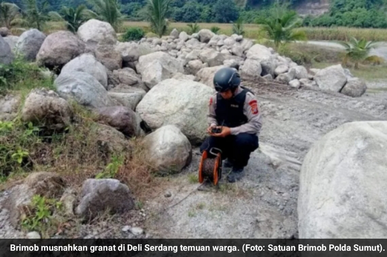 MEDAN, – Satuan Brimob Kepolisian Daerah Sumatera Utara memusnahkan granat di Kutalimbaru, Kabupaten Deli Serdang yang berasal dari temuan warga.