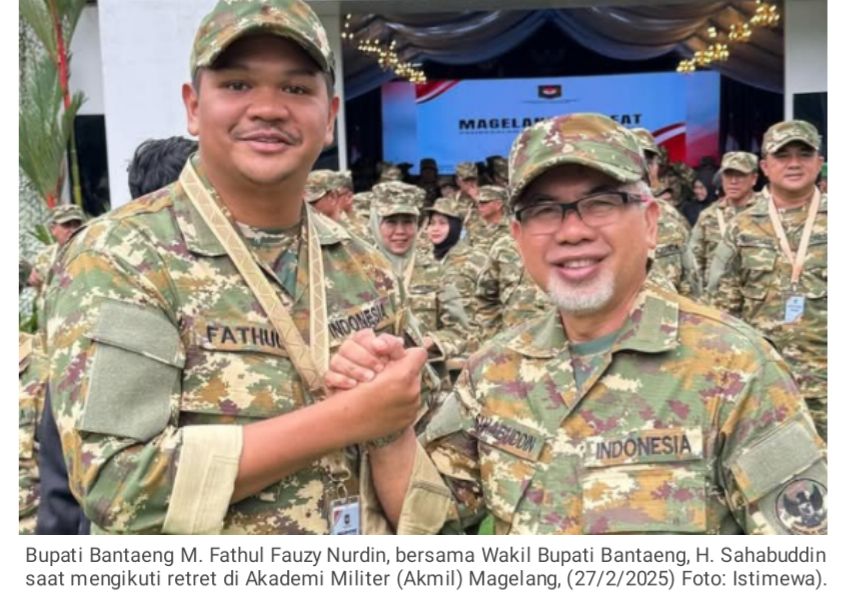 Retret kepala daerah digelar 21-28 Februari 2025. Wakil kepala daerah menyusul mengikuti retret pada Kamis (27/2/2025). Termasuk Wakil Bupati Bantaeng H Sahabuddin yang terlihat semangat dan gagah mengenakan pakaian Komcad TNI lengkap dengan sepatu PDL hitam dan topi loreng.
