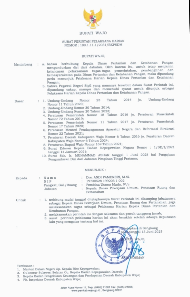 Sebagai penggantinya, Bupati Wajo menunjuk Drs. Andi Pammeneri, M.Si sebagai PLH melalui Surat Perintah Pelaksana Harian Nomor 100.1.111.1/2031/BKPSDM yang diterbitkan pada 13 Juni 2025.