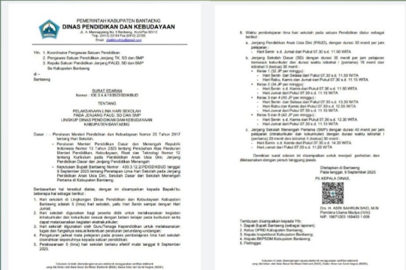 tokcer.news/, BANTAENG – Pemerintah Kabupaten Bantaeng telah mengeluarkan surat edaran tentang pelaksanaan program sekolah 5 hari untuk jenjang PAUD, SD, dan SMP dengan nomor surat 100.3.4.4/1935/DISDIKBUD. Program ini mulai berlaku efektif pada tanggal 9 September 2025. Surat edaran ini ditujukan kepada koordinator pengawas satuan pendidikan, pengawas satuan pendidikan, dan kepala satuan pendidikan jenjang PAUD, SD, dan SMP se-Kabupaten Bantaeng.