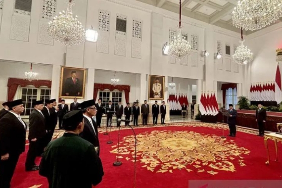 Usai pembacaan keputusan presiden dan daftar nama pejabat yang akan dilantik, Presiden Prabowo kemudian memimpin prosesi pengambilan sumpah jabatan yang diikuti oleh jajaran pejabat baru yang dilantik.
