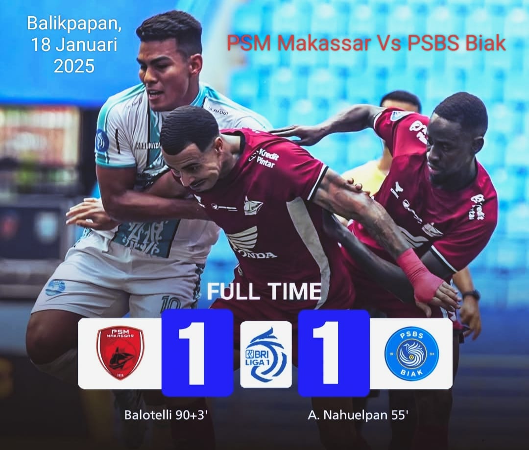 Beruntung, pemain tersebut kembali menunjukkan kualitasnya sebagai Target Men dengan melesatkan gol di masa injuri time tepatnya menit 90+3. Dengan hasil imbang ini, PSM Makassar harus puas berbagi poin dengan tamunya PSBS Biak.