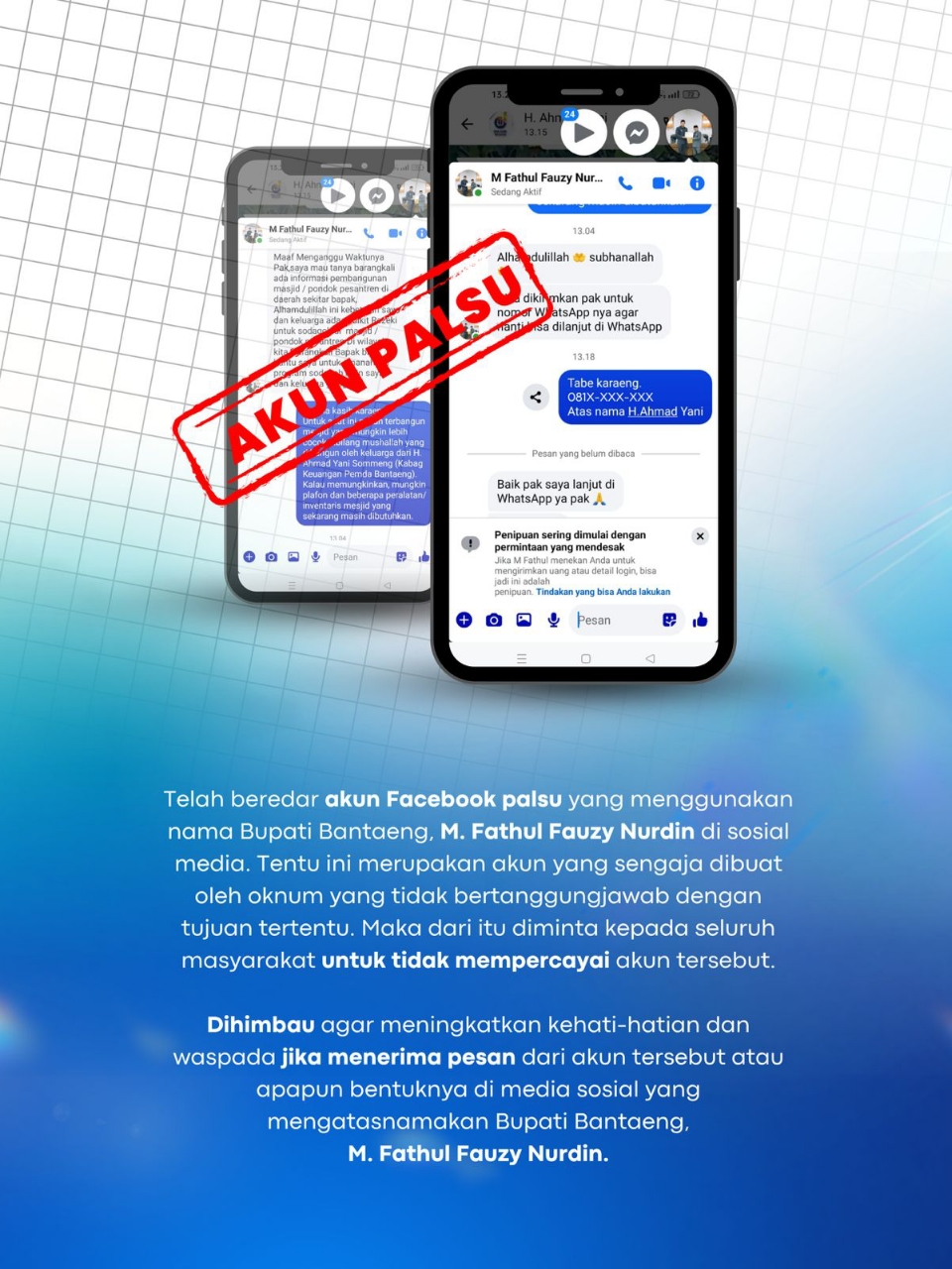 BANTAENG – Masyarakat Bantaeng diminta waspada dengan modus penipuan yang mengatasnamakan Bupati Bantaeng, M. Fathul Fauzy Nurdin pada akun-akun sosial media. Mengingat, salah satu warga mengaku telah dihubungi akun Facebook yang bernama M Fathul Fauzy Nurdin.